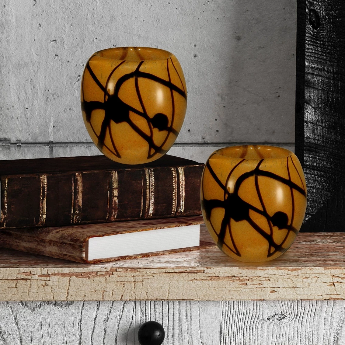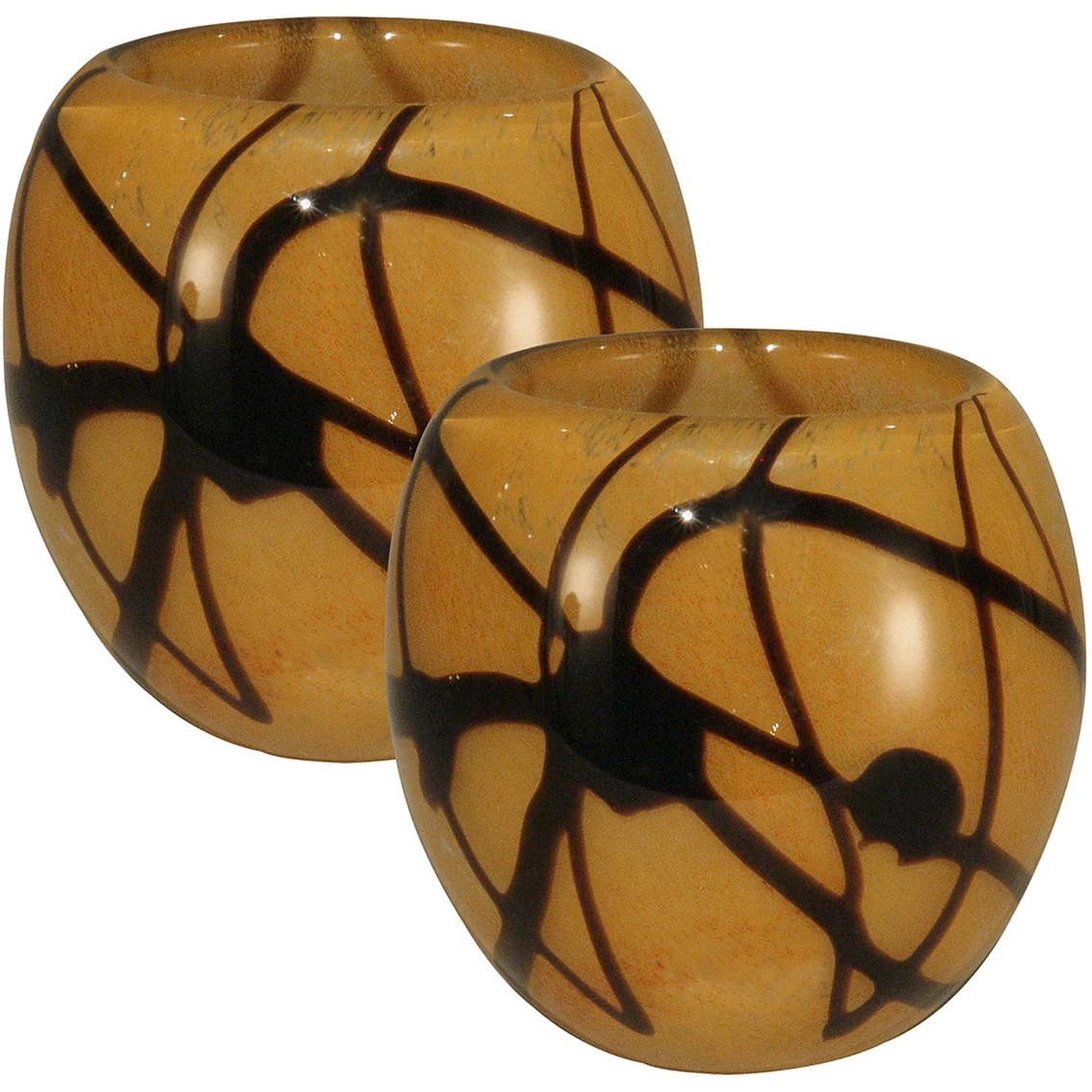 The golden glow of this 2-piece San Luis Candle Holder Set adds a warm touch to any decor style in your home. Each of the matching votive holders features a base of lustrous golden Favrile art glass that will glitter when a lighted candle is placed inside. Ribbons of dark brown are splattered throughout the surface, which adds texture. Every Favrile art glass piece is hand blown meaning no two pieces are exactly alike. The neutral classic colors of this 2-piece San Luis Candle Holder Set ensures that it is a perfect gift that will be treasured for a lifetime.