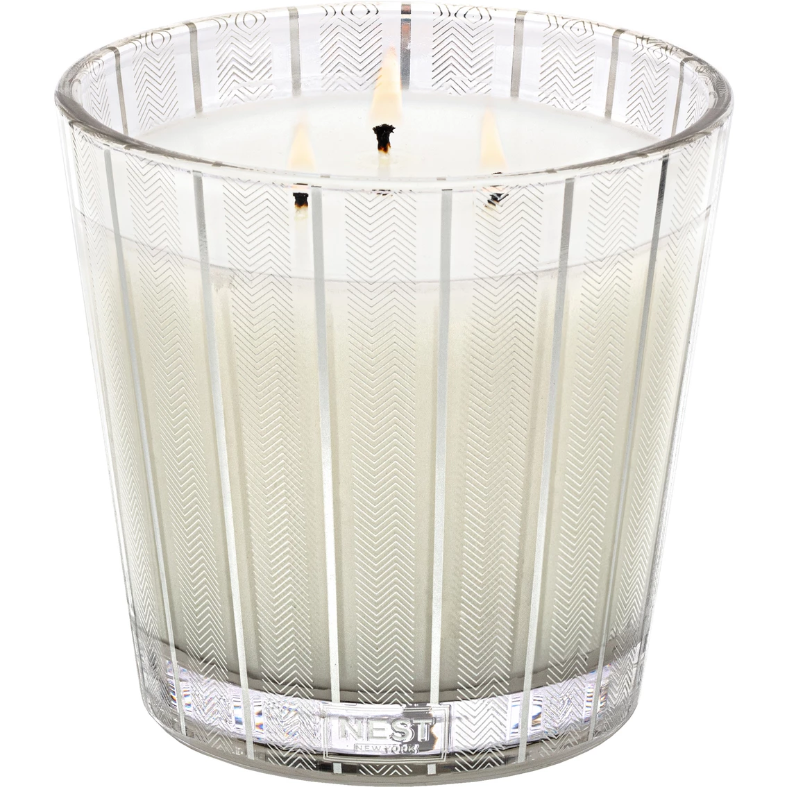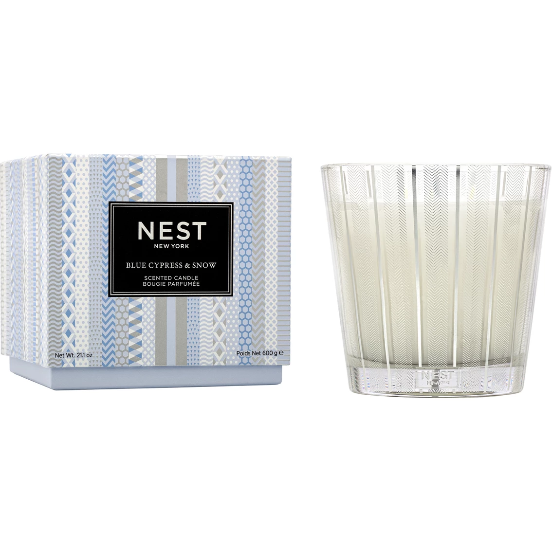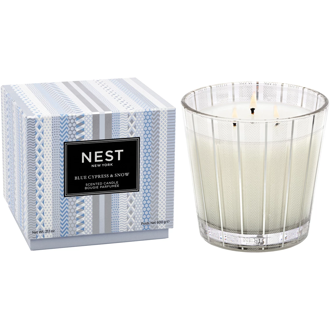 Create the aroma of a snow-covered mountain retreat in winter with this Nest 3-wick candle featuring notes of crisp blue cypress, juniper berry, and hints of smoked vanilla bean. This exquisitely fragranced 3-wick candle elevates everyday living and entertaining. It is meticulously crafted with a proprietary premium wax formulated so the candle burns cleanly and evenly and infuses a room with exceptional scent. Housed in a glass vessel etched with a festive, metallic silver design. Approximate burn time: 75-100 hours. Model: NEST03BSN002.