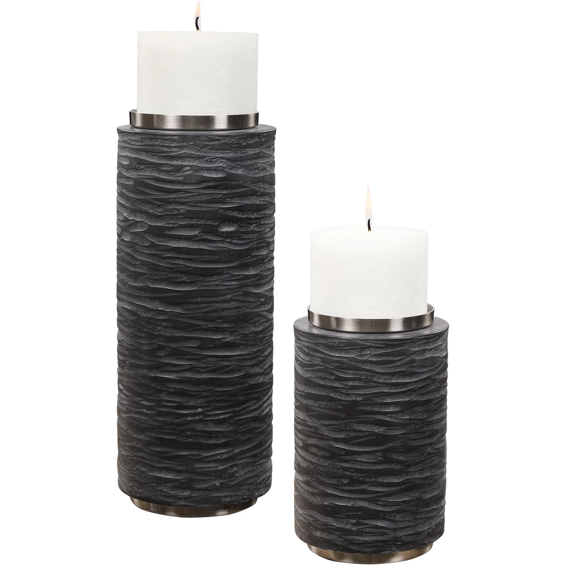 Reminiscent of chiseled stone, these Uttermost candle-holders feature a stone gray finish that exudes a masculine luxe style. Each is accented by a brushed nickel candle cup and includes two, 4 x 3 in. distressed white candles. Sizes: Small: 5 x 8 x 5 in. Large: 5 x 13 x 5 in. Model: 17873.
